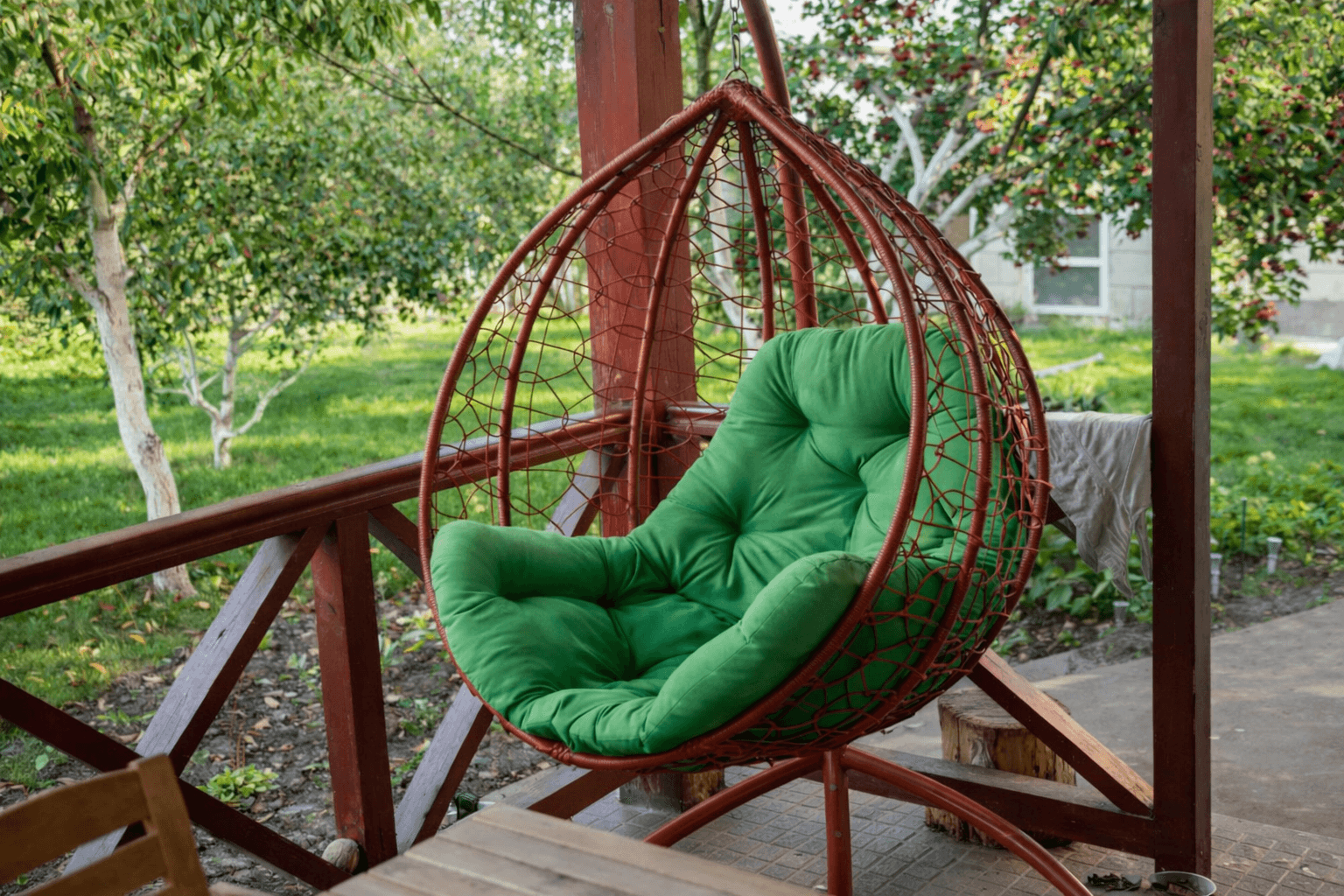 Η εικόνα αποτυπώνει μια αιωρούμενη πολυθρόνα με πλεκτό σκελετό σε γήινες αποχρώσεις και μαλακό πράσινο μαξιλάρι. Ο συνδυασμός αυτός δημιουργεί αίσθηση αρμονίας με το φυσικό περιβάλλον, ιδανική για χώρους που θέλουν να αποπνέουν ηρεμία και ισορροπία.