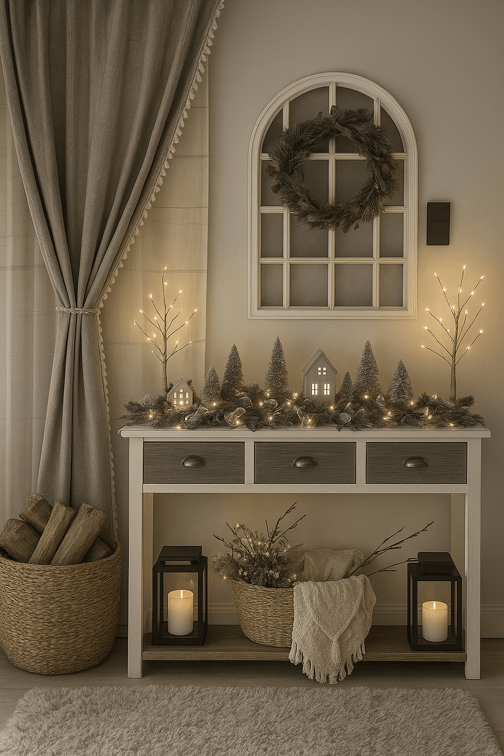 Ένα τραπέζι κονσόλα γίνεται σημείο αναφοράς όταν “ντύνεται” με φύλλα, φωτάκια και χειμωνιάτικες λεπτομέρειες σε muted tones.