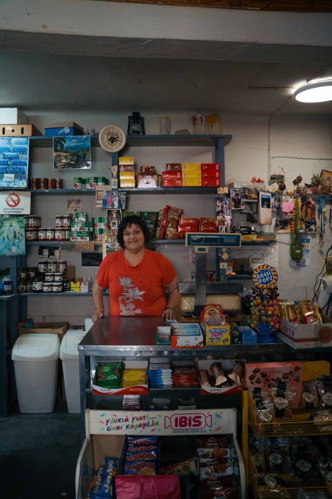 Στην πλατεία συναντήσαμε το παντοπωλείο της Αφροδίτης. Από το 1964 λειτουργεί σχεδόν αμετάβλητο, με ξύλινα ράφια, γυάλες με μπαχαρικά και παλιές προθήκες. Είναι ένα ζωντανό μουσείο του ελληνικού εμπορίου και ένας τόπος που μυρίζει νοσταλγία.