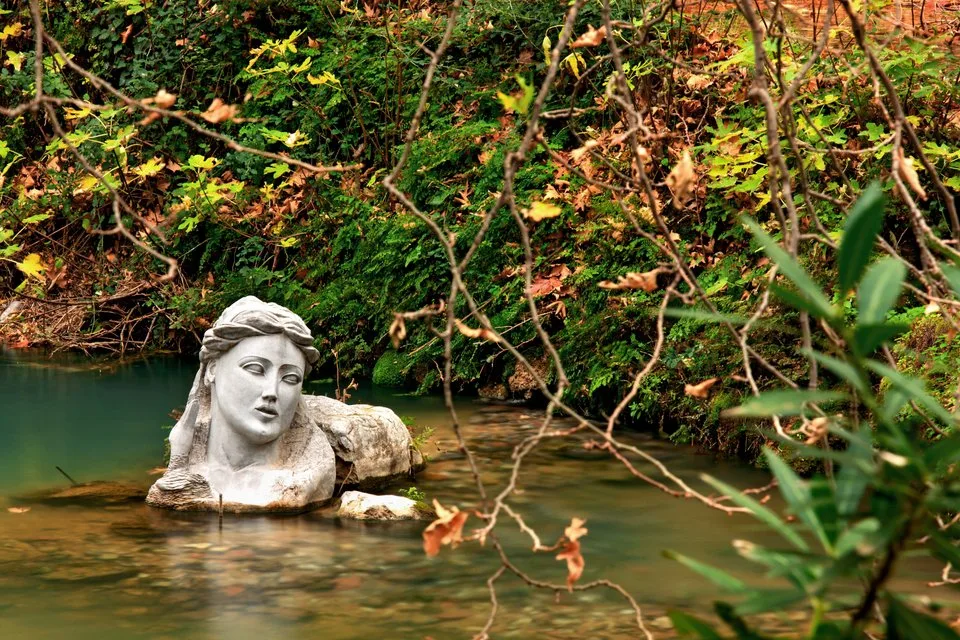 Η προτομή της νύμφης Έρκυνας, έργο του γλύπτη Σπύρου Γουργιώτη, δεσπόζει θεατρικά μέσα στο τοπίο, προσθέτοντας μια μυθική πινελιά.