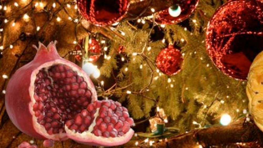 Το ρόδι, σύμβολο αφθονίας και γονιμότητας, σπάει στην είσοδο του σπιτιού μόλις αλλάξει ο χρόνος. Όσο περισσότερα σπόρια σκορπιστούν, τόσο μεγαλύτερη θεωρείται η καλοτυχία για τη νέα χρονιά.